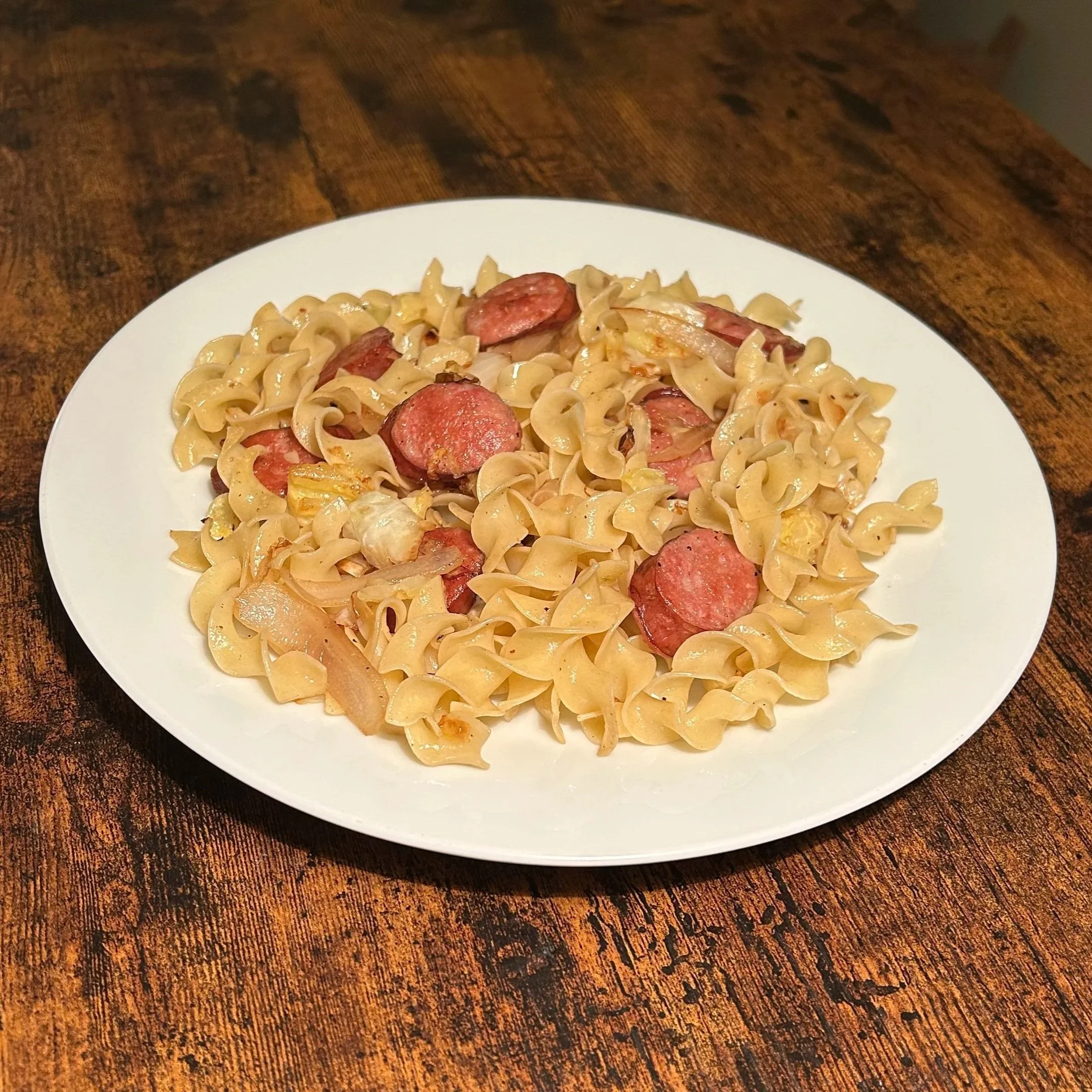 In the pan that was used for the sausage, add the butter and heat over medium high. Add the onions and cook for 2-3 minutes, then add the cabbage. Season with salt & pepper, and cook until the vegetables are soft and slightly browned. Add the sausage and noodles to the pan and cook for 2 minutes. Plate and serve immediately.