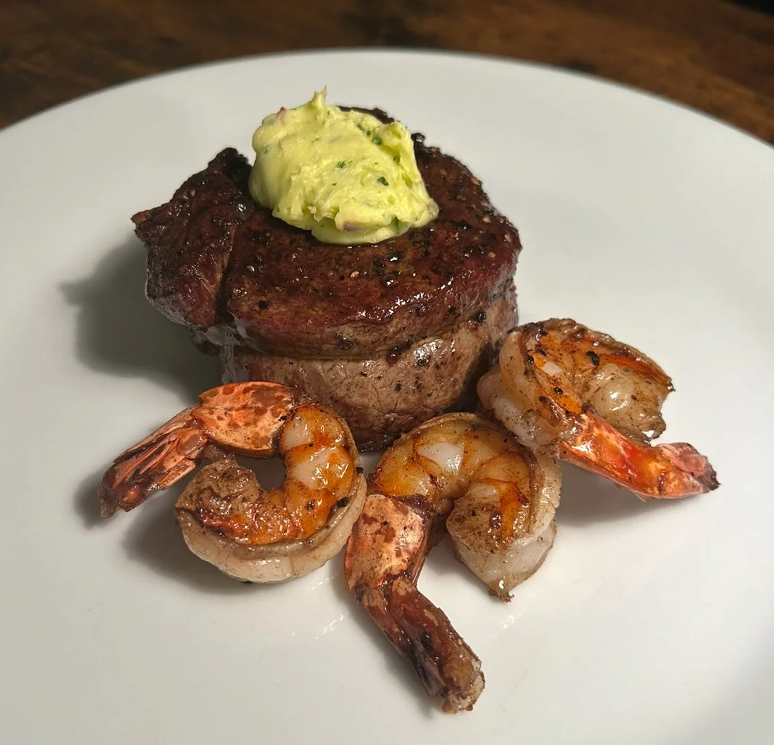 To serve, plate the steak and shrimp together with a knob of the herb butter on top of the steak.